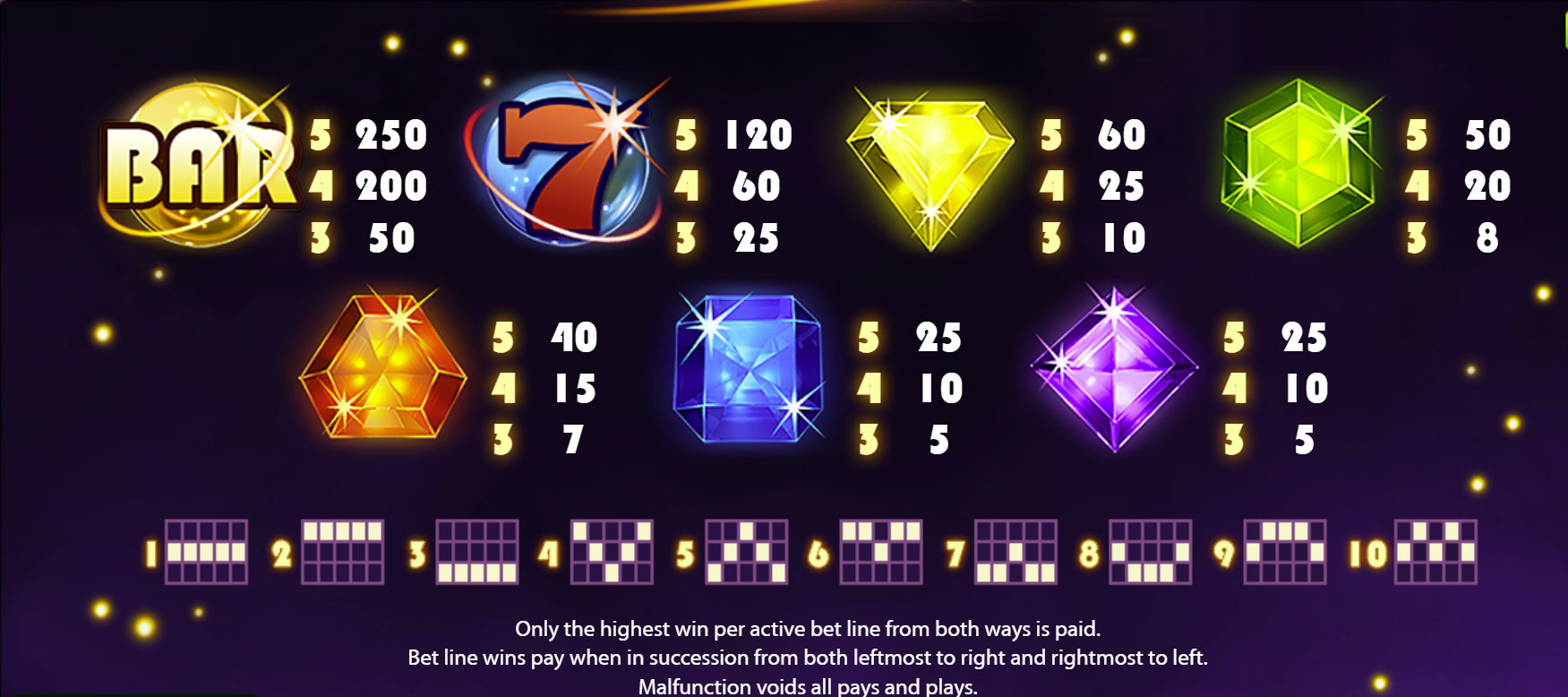 | Payline Structure | 10 predetermined (dual-direction payouts) |